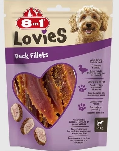 8in1 Lovies kacsafilék ízletes kacsamellszeletek, amelyek nyersbőr- és búzamentes recept alapján, hozzáadott cukor nélkül készülnek.