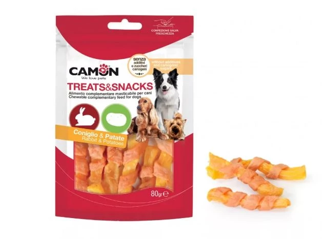 Ízletes, nyúlhússal és édesburgonyával készült kiegészítő jutalomfalat kutyák számára. Kiváló választás jutalmazáshoz, két étkezés között adható finom falatként