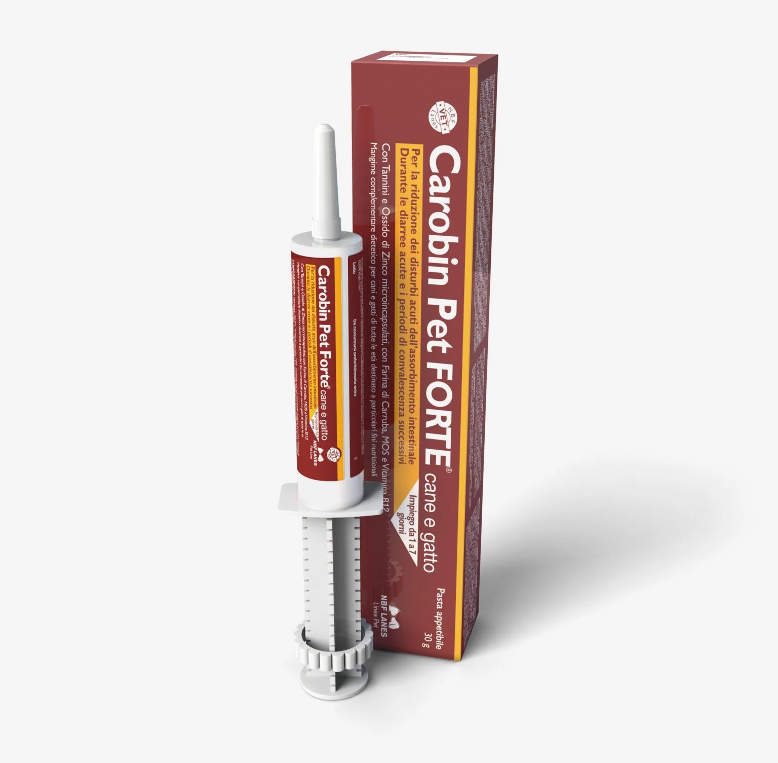 Carobin Pet Forte jól emészthető szénhidrátokat, mikrokapszulázott tannint és cink-oxidot, mannánoligoszacharidokat (MOS), szentjánoskenyérmagot, nukleotidokat, B12-vitamint és nagy dózisú elektrolitokat tartalmaz a hasmenésből való felépülés támogatása érdekében.