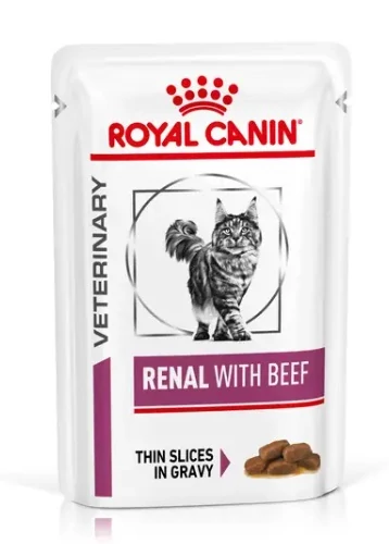 A ROYAL CANIN® RENAL WITH BEEF thin slices in gravy, vékony szeletek pecsenyelében marhahússal, nedves állateledel komplett diétás macskaeledel, amely krónikus veseelégtelenség esetén támogatja a veseműködést, korlátozott mennyiségű foszfor- és csökkentett, de kiváló minőségű fehérjetartalmának köszönhetően. A RENAL WITH BEEF nedves állateledel ezen felül összetétele folytán csökkenti az oxalát húgykő képződést, csökkentett kalcium- és D vitamin-tartalmának, illetve vizelet lúgosító tulajdonságainak köszönhetően. JAVALLATOK: Az alkalmazás illetve az alkalmazás idejének meghosszabbítása előtt javasolt állatorvos véleményét kikérni. A RENAL WITH BEEF nedves állateledelt krónikus veseelégtelenség esetén, illetve az oxalátkő képződés csökkentésére 6 hónapig alkalmazza.